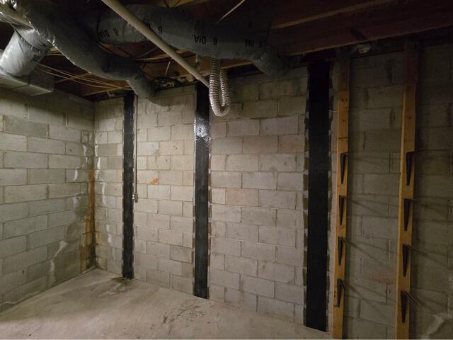 In Capon Bridge, WV, you notice in the 'before' photo that a homeowner faced significant foundation issues in their basement with a visibly bowing wall needing repair. We provided an effective solution by installing the cutting-edge CarbonArmor® system, specializing in foundation repair. Many times stronger than steel, the CarbonArmor® system uses carbon fiber-reinforced polymers to permanently stabilize the wall without invasive methods. The 'after' photo demonstrates the stable and secure foundation achieved with CarbonArmor® straps and exclusive ArmorLock brackets, ensuring long-term durability for the homeowner.